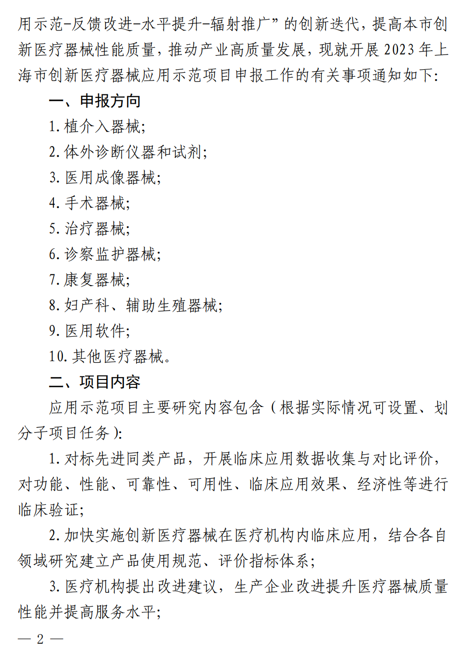 根據《通知》,為加快生物醫藥創新產品應用推廣,支持創新醫療器械在醫療機構開展應用示范,形成“應用示范-反饋改進-水平提升-輻射推廣”的創新迭代,提高上海市創新醫療器械性能質量,推動產業高質量發展,現就開展2023年上海市創新醫療器械應用示范項目申報工作。