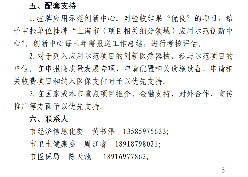 配套支持方面,《通知》明確,對于列入應用示范項目的創新醫療器械、參與示范項目的單位,在申報高質量發展專項、申請配置相關設施設備、申請相關收費項目和納入醫保支付時予以優先支持。在國家或本市重點項目推介、金融支持、對外合作、宣傳推廣等方面予以優先支持。