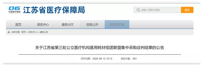 8月12日,江蘇省醫保局發布《關于江蘇省第三輪公立醫療機構醫用耗材組團聯盟集中采購談判結果的公告》,對初次置換人工膝關節、人工硬腦(脊)膜、疝修補材料相關組別的聯盟帶量采購談判中選結果予以公布。