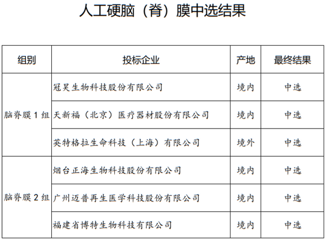人工硬腦(脊)膜中選企業包括冠昊生物、天新福(北京)醫療器材、英特格拉生命科技等械企;