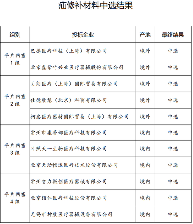 疝修補材料中選企業包括巴德醫療、貝朗醫療、柯惠醫療等械企。