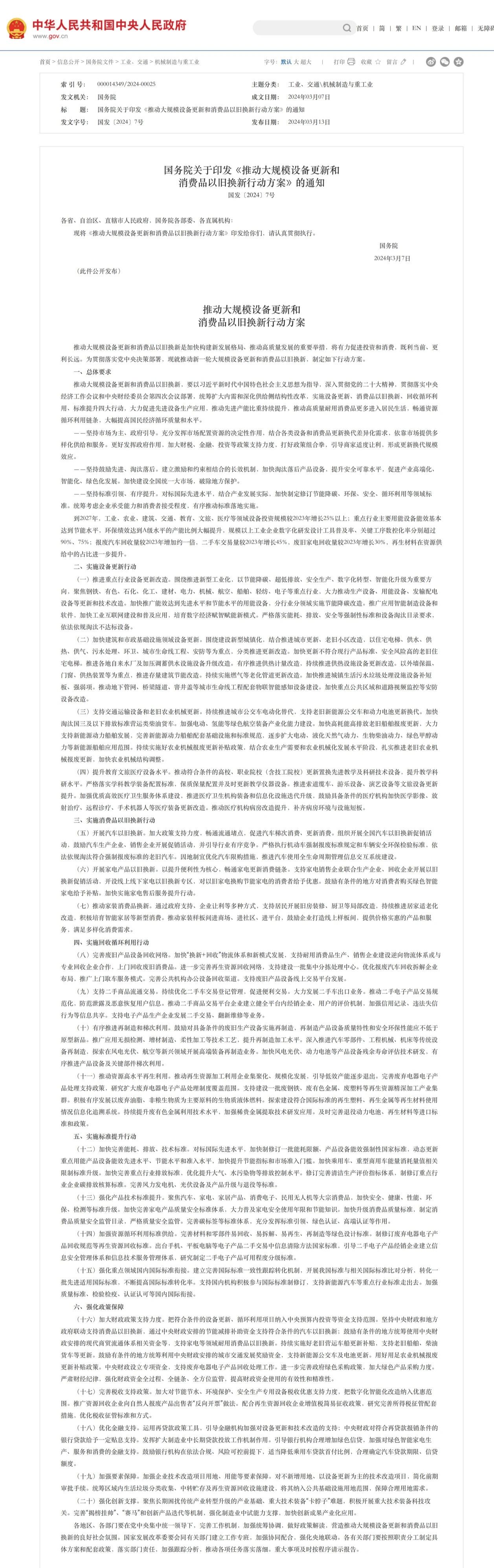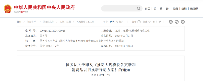 3月13日,國務(wù)院發(fā)布《推動大規(guī)模設(shè)備更新和消費(fèi)品以舊換新行動方案》(以下簡稱《方案》)。其中指出,到2027年,工業(yè)、農(nóng)業(yè)、建筑、交通、教育、文旅、醫(yī)療等領(lǐng)域設(shè)備投資規(guī)模較2023年增長25%以上(文末附全文)。
