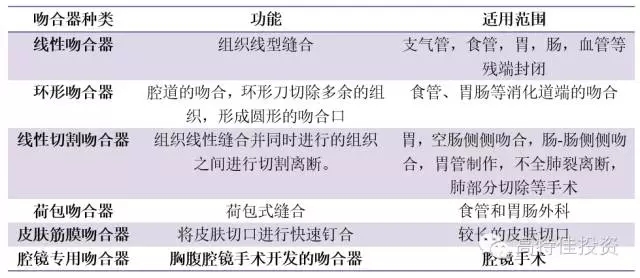 根據(jù)適用范圍不同,吻合器主要可分為線性吻合器、環(huán)形吻合器、線性切割吻合器、荷包吻合器、皮膚筋膜吻合器和腹腔鏡專用吻合器等。