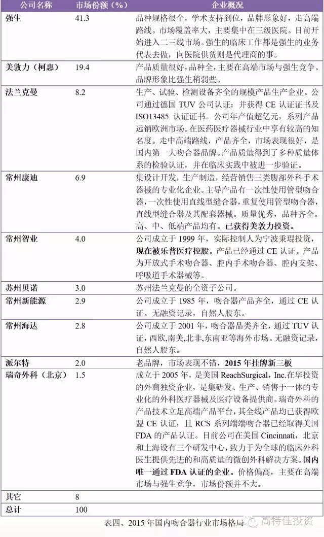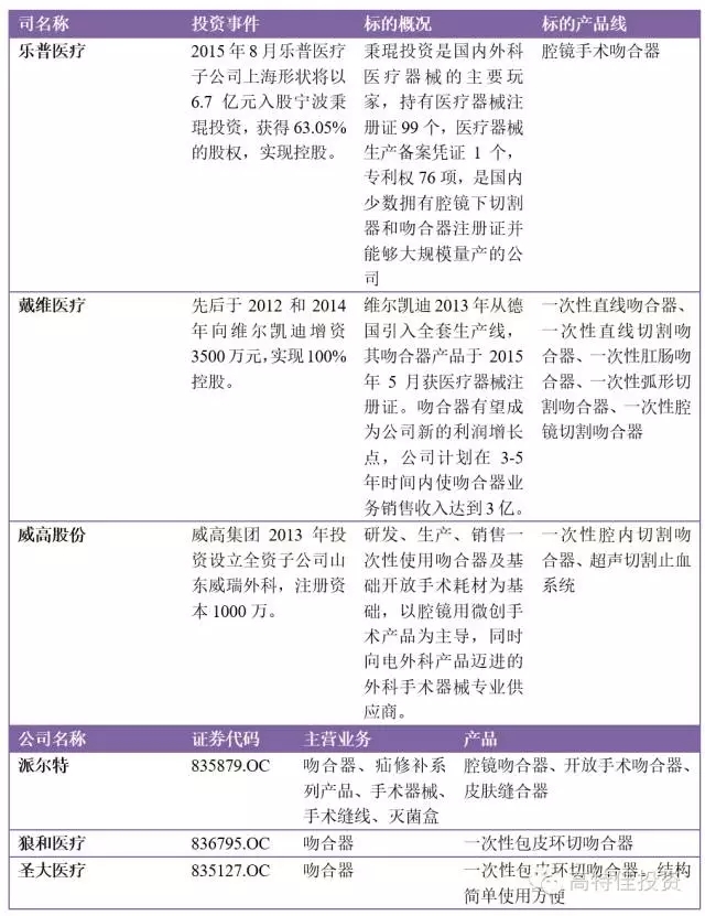 吻合器企業(yè)的成長性不足,銷售過億的企業(yè)屈指可數(shù)。企業(yè)若有一定市場占有率則是比較好的被上市公司并購的標的。需關注擬投資企業(yè)的產(chǎn)品線、品牌、市場推廣能力以及醫(yī)保地域差異等綜合因素。此外可關注有特色的吻合器行業(yè)如男科吻合器。