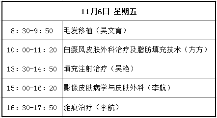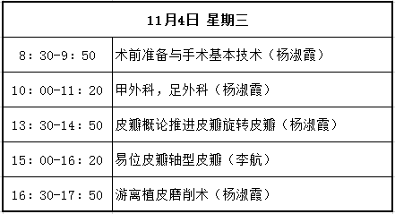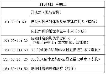 課程內容涉及皮膚外科的各種理論和基本技能及常見術式,諸如皮瓣、植皮等復雜成形技術,Mohs顯微描記手術,毛發移植,磨削,腋臭微小切口手術,皮膚腫瘤診治、激光美容、皮膚鏡應用等。主要授課人包括李航、楊淑霞、涂平等多年從事皮膚外科或皮膚病理的專家。課程時間