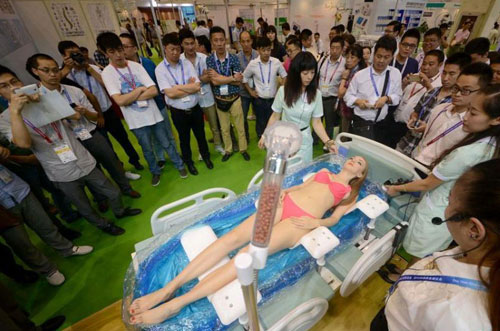 8月29日,一位西洋美女模特扮演“病人”,配合工作人員展示一款多功能護理床,吸引了眾多展會觀眾駐足觀看。