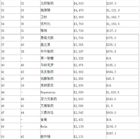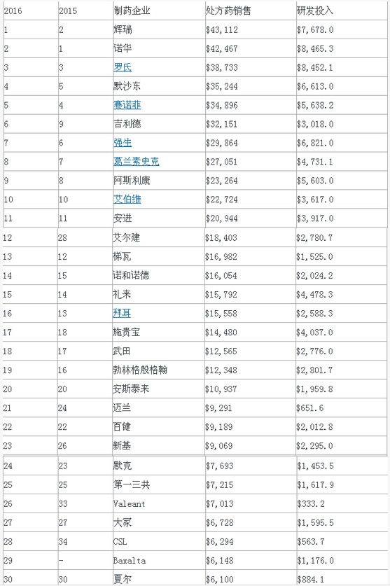 2016年全球制藥企業(yè)50強(qiáng)出爐!