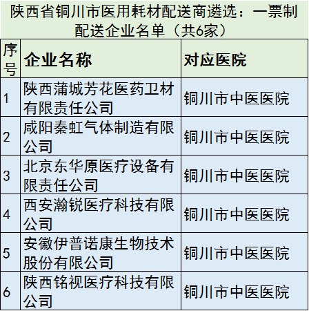 6月22日,陜西省銅川市衛計局發布了銅川市城市公立醫院藥品、耗材配送企業遴選結果公示,共有71家配送商拿到了該市耗材“兩票制”新政下的配送資格。