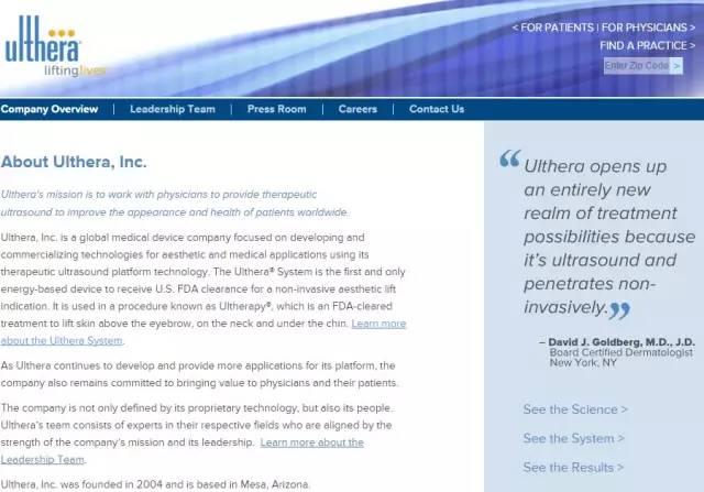 美國Ulthera公司,成立于2004年,位于美國亞利桑那州,梅薩市。 Ulthera公司是全球頂級醫療設備公司,專注于開發超聲波美容儀器。