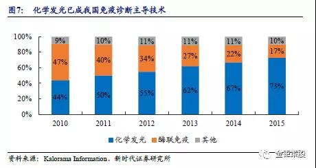 化學(xué)發(fā)光快速取代酶聯(lián)免疫,已成為免疫診斷主導(dǎo)技術(shù)平臺。免疫診斷領(lǐng)域的技術(shù)歷經(jīng)了多個發(fā)展階段,從放射免疫、酶聯(lián)免疫、免疫膠體金到化學(xué)發(fā)光技術(shù)、電化學(xué)發(fā)光、流式熒光技術(shù)等。化學(xué)發(fā)光憑借其靈敏度高、特異性好、自動化程度高、精密度好、準(zhǔn)確率高等優(yōu)勢在臨床應(yīng)用中迅速推廣,快速實現(xiàn)了對酶聯(lián)免疫的替代,目前已經(jīng)成為免疫定量分析領(lǐng)域的主流技術(shù),占據(jù)了超過70%的市場份額。