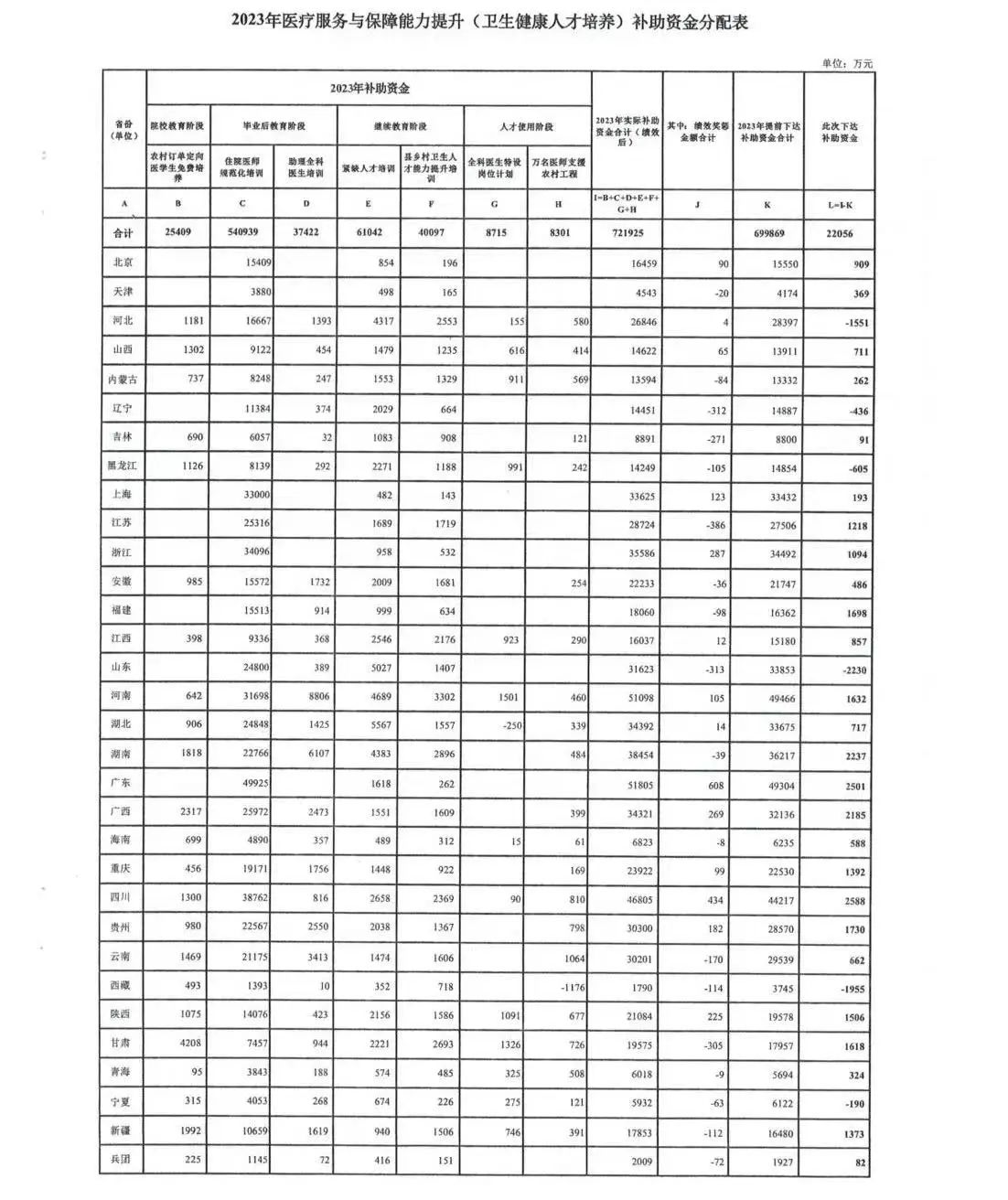 2023年醫療服務與保障能力提升(公立醫院綜合改革)補助資金 (第二批)分配表顯示,此次下達補助資金預算總計30億元,每個地區2億元。