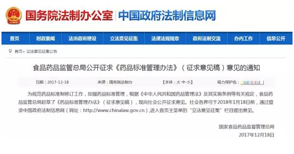 12月18日,國家食藥監(jiān)管總局通過國務院法制辦公室官網(wǎng)發(fā)布《藥品標準管理辦法》(征求意見稿)(以下簡稱“征求意見稿”)。