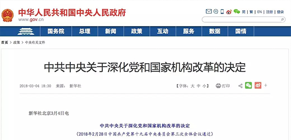 據(jù)新華社3月4日報道,中國共產(chǎn)黨第十九屆中央委員會第三次全體會議通過《中共中央關(guān)于深化黨和國家機(jī)構(gòu)改革的決定》(下稱《決定》),并正式對外公布。