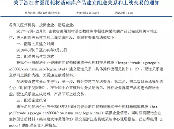 3月6日,浙江省藥械采購中心終于發布了《關于浙江省醫用耗材基礎庫產品建立配送關系和上線交易的通知》(《通知》),意味著浙江省“三流合一”醫用耗材采購新平臺配送關系建立開始落地!