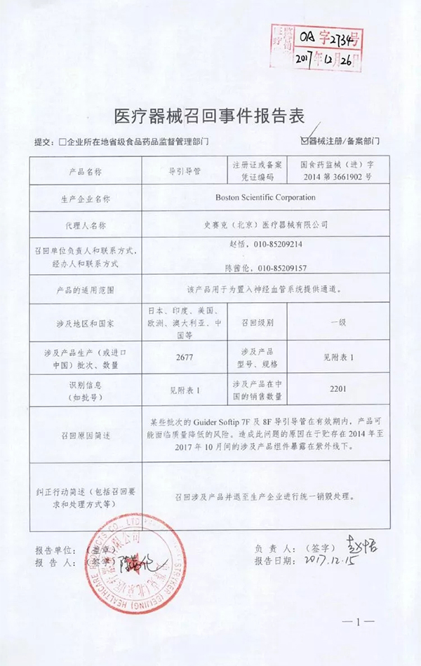 就在昨天,CFDA發(fā)布了《Boston Scientific Corporation對(duì)導(dǎo)引導(dǎo)管主動(dòng)召回 》。