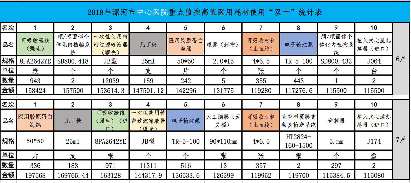 梳理漯河市衛(wèi)計委發(fā)布的6月、7月耗材用量公示數(shù)據,數(shù)十個耗材產品兩次進入了前十名。