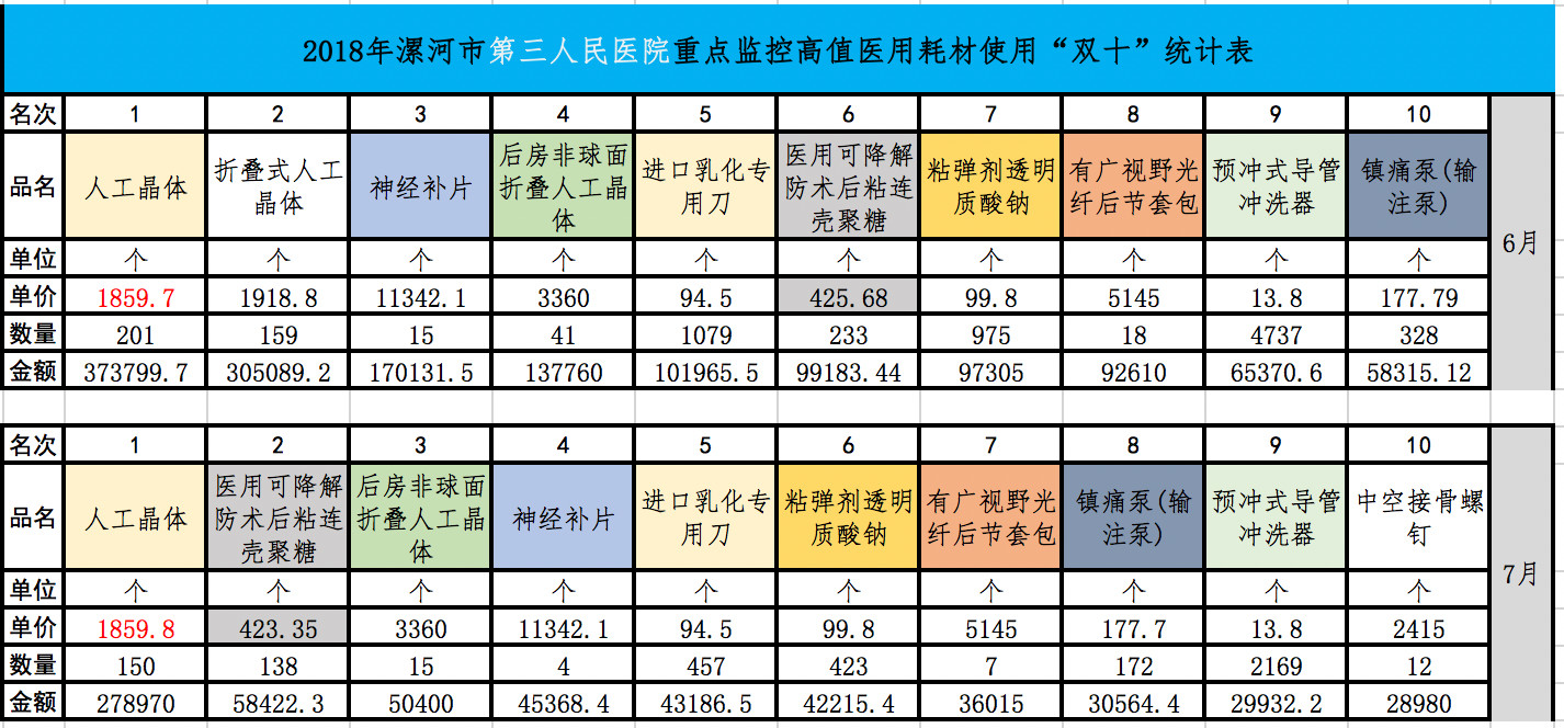 漯河市第三人民醫(yī)院6月、7月“雙十”統(tǒng)計表顯示,各月的前十名里,有9種耗材產品重復。即,前十名中的九個位置被固定產品占據,可想而知這些產品被限用、停用的風險之大。