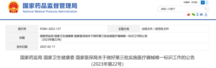 2月17日,國家藥監(jiān)局、國家衛(wèi)健委、國家醫(yī)保局發(fā)布《關(guān)于做好第三批實施醫(yī)療器械唯一標識工作的公告》,提出開展第三批醫(yī)療器械唯一標識工作。