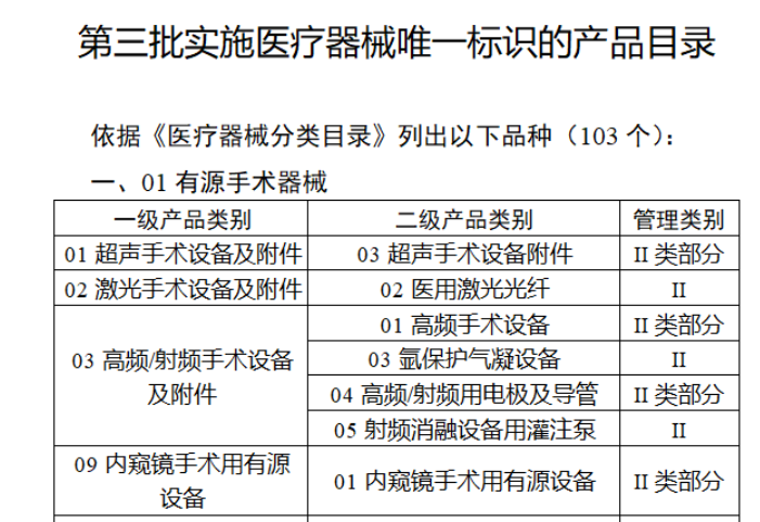 《公告》指出,按照風(fēng)險程度和監(jiān)管需要,確定部分臨床需求量較大的一次性使用產(chǎn)品、集中帶量采購中選產(chǎn)品、醫(yī)療美容相關(guān)產(chǎn)品等部分第二類醫(yī)療器械作為第三批醫(yī)療器械唯一標識實施品種。