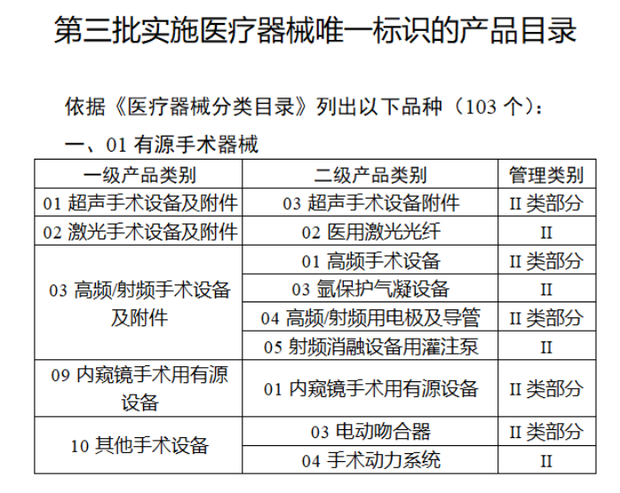 共有103種醫(yī)療器械被納入此次唯一標識實施工作中,包括超聲手術(shù)設(shè)備、激光手術(shù)設(shè)備及附件、高頻/射頻手術(shù)設(shè)備及附件、內(nèi)窺鏡手術(shù)用有源設(shè)備、神經(jīng)和心血管手術(shù)器械-心血管介入器械、骨科手術(shù)器械、診斷X射線機、光治療設(shè)備、起搏系統(tǒng)分析設(shè)備、注射泵、臨床檢驗器械等。