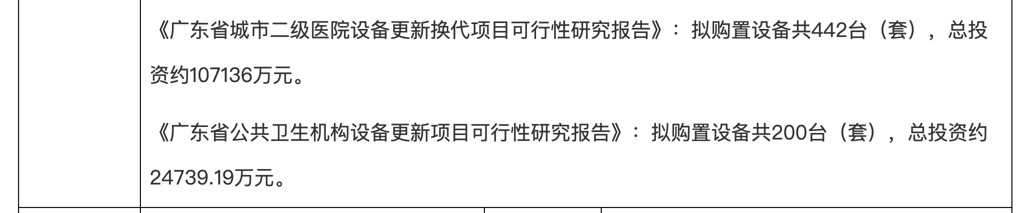 《廣東省縣域醫(yī)共體設(shè)備更新項(xiàng)目(珠三角)可行性研究報(bào)告》:擬購(gòu)置設(shè)備共20種288臺(tái)(套),總投資約41440萬(wàn)元。