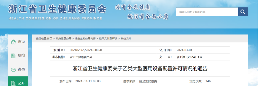 近日,浙江衛(wèi)健委發(fā)布《浙江省衛(wèi)生健康委關于乙類大型醫(yī)用設備配置許可情況的通告》,公布2023年第四季度醫(yī)療機構申請配置乙類大型醫(yī)用設備申請許可情況。