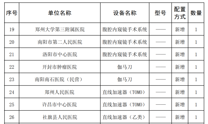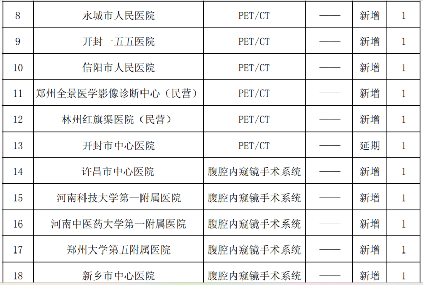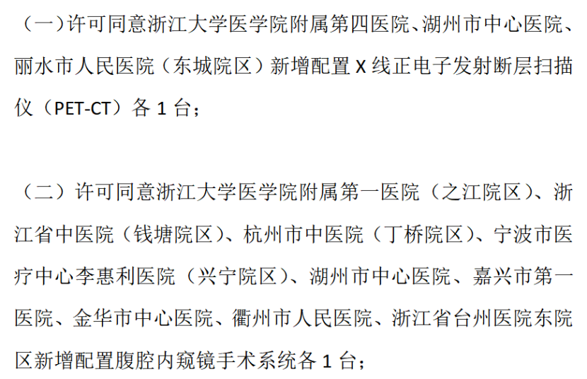 根據(jù)《通告》內容,同意新增配置X線正電子發(fā)射斷層掃描儀(PET-CT)共3臺,同意新增配置腹腔內窺鏡手術系統(tǒng)共9臺,同意新增配置醫(yī)用直線加速器(LA)共7臺。
