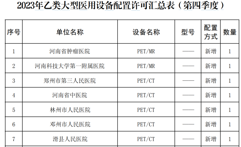 同月,河南衛(wèi)健委公布了2023年第四季度乙類大型醫(yī)用設備配置許可情況。