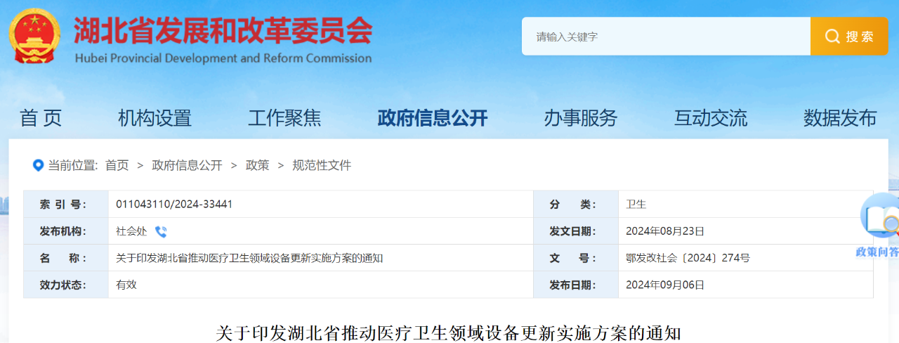 近日,湖北省發改委印發《湖北省推動醫療衛生領域設備更新實施方案》(完整見文末)。