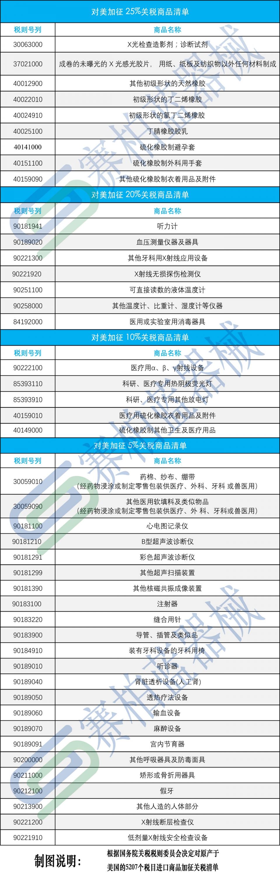 具體來看,加征25%關稅的商品共2493個,涉及醫療器械的有X光檢查造影劑;診斷試劑,以及X光感光膠片、外科用手套等耗材;