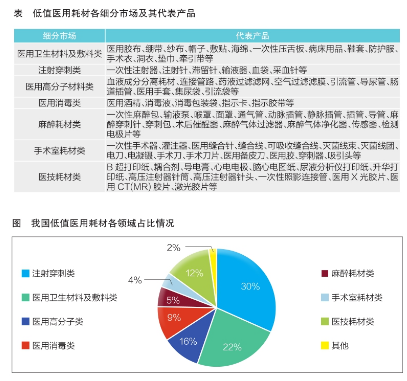 低值醫用耗材主要是指醫療機構在開展醫療服務過程中經常使用的一次性衛生材料(如紗布、棉簽、手套、注射器等),可以細分為醫用衛生材料及敷料類、注射穿刺類、醫用高分子材料類、醫用消毒類、麻醉耗材類、手術室耗材類和醫技耗材類(低值醫用耗材細分市場及其代表產品見表)。