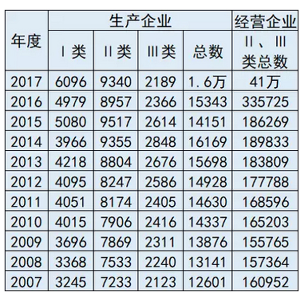 而在經(jīng)過了2015年的暴跌、2016年的恢復(fù)增長(zhǎng)后,全國實(shí)有械企的總數(shù)量在2017年度又恢復(fù)到了2014年的高峰水平。