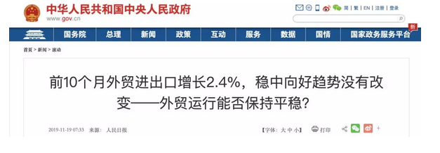 11月19日,國務院官網轉發了人民日報文章,文章指出,前10個月,我國實現外貿進出口總值25.63萬億元,同比增長2.4%,其中出口13.99萬億元,增長4.9%。