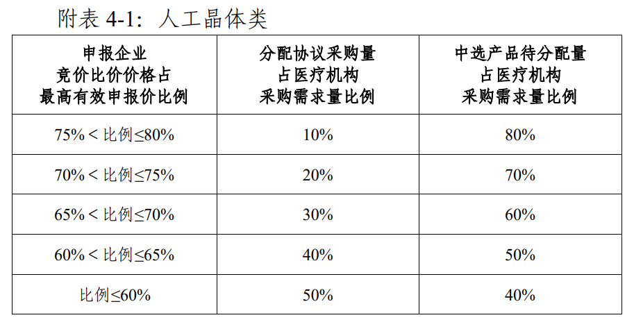 與脊柱國(guó)采類似,此次集采擬中選規(guī)則中的規(guī)則二,是行業(yè)俗稱的“躺平復(fù)活”機(jī)制。其中,人工晶體降40%、運(yùn)動(dòng)醫(yī)學(xué)降60%可獲得擬中選資格(具體折算規(guī)則、適用范圍見文件)。此外,第四批國(guó)采還增加了規(guī)則三:對(duì)于申報(bào)企業(yè)不超過2家的競(jìng)價(jià)單元,人工晶體降20%、運(yùn)動(dòng)醫(yī)學(xué)降30%可獲得擬中選資格。