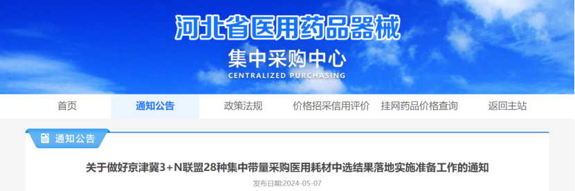 5月7日, 河北省醫用藥品器械集中采購中心發布《關于做好京津冀3+N聯盟28種集中帶量采購醫用耗材中選結果落地實施準備工作的通知》(以下簡稱《通知》),其中明確,28種醫用耗材中選結果擬定于2024年5月15日在河北省落地實施。