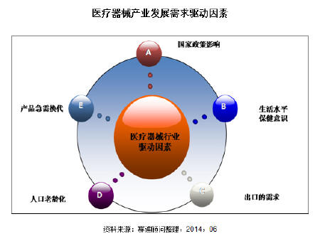 賽迪顧問發布《中國醫療器械產業發展戰略研究(2014)》。報告顯示,我國醫療器械有著廣闊的市場空間,國家政策、經濟生活水平和人們保健意識的提高、人口老齡化、產品出口和產品更新換代等因素均對醫療器械產業發展形成較大影響。