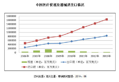 報告數據顯示,2013年我國醫療器械貿易總額達343.1億美元,同比增長14.13%,較2012年增長1個百分點;其中,出口額為193.35億美元,同比增長9.92%,較2012年下降了2個百分點;進口額為149.75億美元,同比增長20.07%,較2012年增長5.5個百分點;貿易順差43.6億美元,同比下降14.8%。