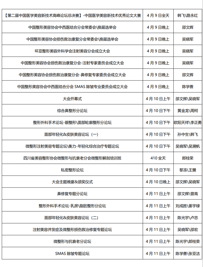 中國醫學美容新潮流,傳播中國醫學美容新理念,展示了中國醫學美容新技術的發展趨勢,并促進了相關成果的交流和推廣。為持續推動中國醫學美容的發展與繁榮,2021第二屆中國醫學美容新技術高峰論壇、2021中國整形美容協會中西醫結合分會西南專委會學術年會、四川省美容整形協會面部整形與修復再生分會學術年會擬于2021年4月8日至4月11日在中國醫美之都——成都召開。