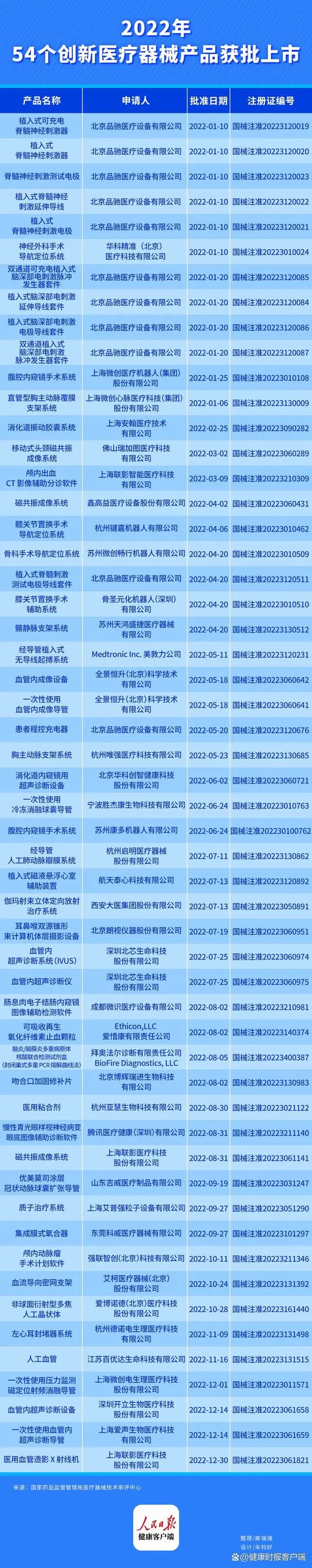 隨著醫(yī)療器械審評審批制度改革縱深推進,國產(chǎn)創(chuàng)新器械步伐繼續(xù)加快。據(jù)人民日報健康客尺戶端梳理發(fā)現(xiàn),2022年國家藥監(jiān)局公示了54個三類創(chuàng)新器械獲批上市,相目較2021年的35個有大幅提升。