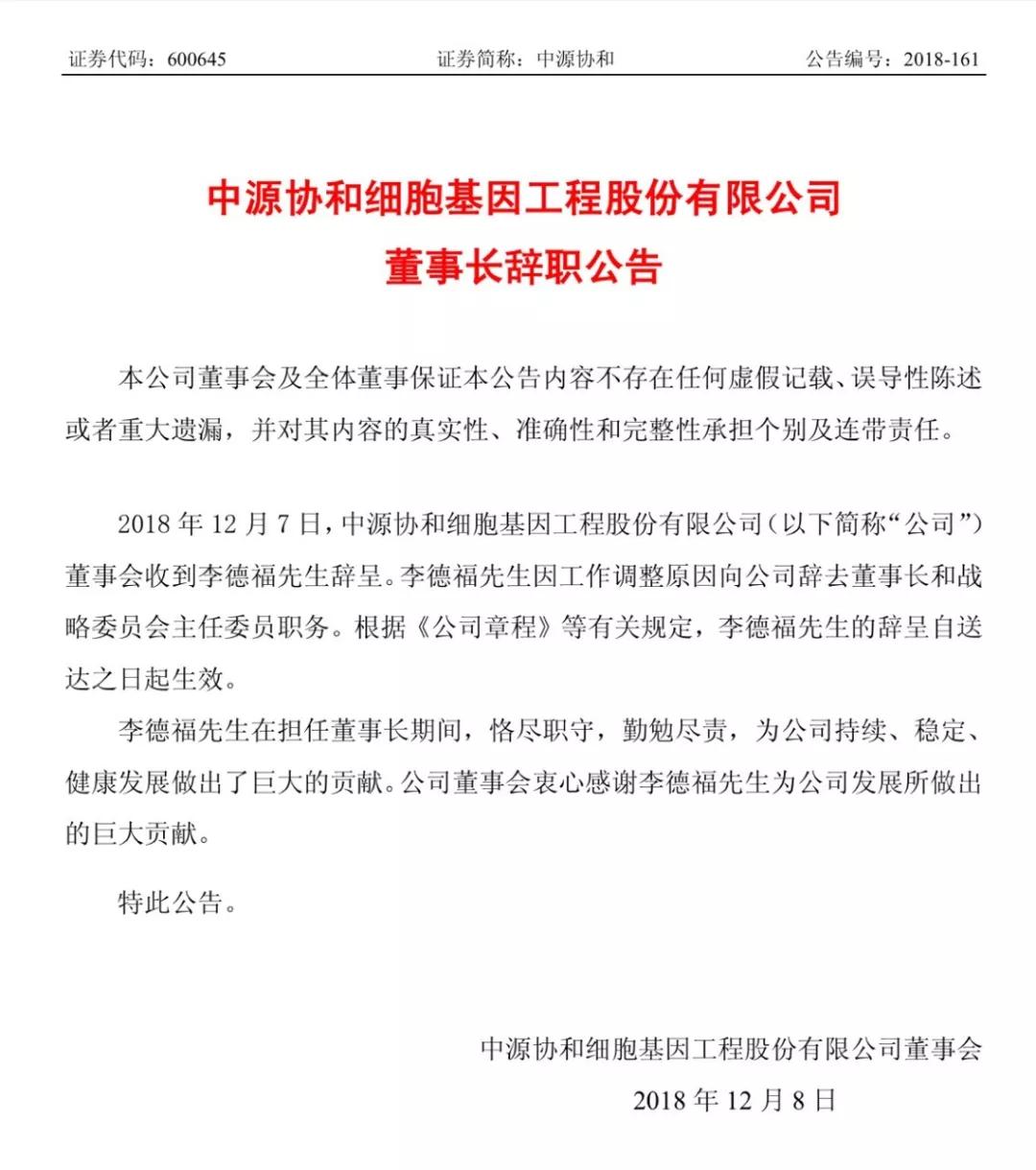12月8日,A股上市醫(yī)療器械公司中源協(xié)和(全稱:中源協(xié)和細胞基因工程股份有限公司)發(fā)布公告稱,因工作調(diào)整原因,公司董事會收到李德福先生辭呈,其向公司辭去董事長和戰(zhàn)略委員會主任委員職務(wù)。