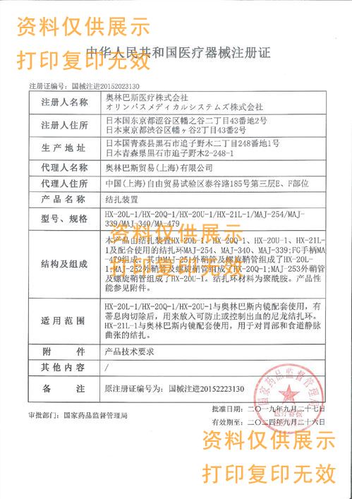 奧林巴斯結扎裝置HX-20L-1、HX-20Q-1、HX-20U-1、HX-21L-1及配合使用的結扎環MAJ-254、MAJ-340、MAJ-339;FG手柄MA-479組成。其中MAJ-251外鞘管及螺旋鞘管組成了HX-20L-1;MAJ-252外鞘管及螺旋鞘管組成了HX-20Q-1;MAJ-253外鞘管及螺旋鞘管組成了HX-20U-1。結扎環材料為聚酰胺。